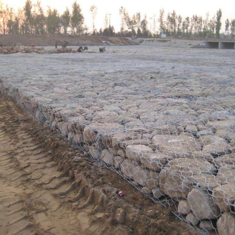 雷諾護(hù)墊是厚度在0.17-0.3m的網(wǎng)箱結(jié)構(gòu),在現(xiàn)場用于裝填石頭。主要用作河道、岸坡、路基邊坡防護(hù)結(jié)構(gòu)。既可防止河岸遭水流、風(fēng)浪侵襲而破壞,又實現(xiàn)了水體與坡下土體間的自然對流交換功能,達(dá)到生態(tài)平衡。坡上植綠可增添景觀、綠化效果。