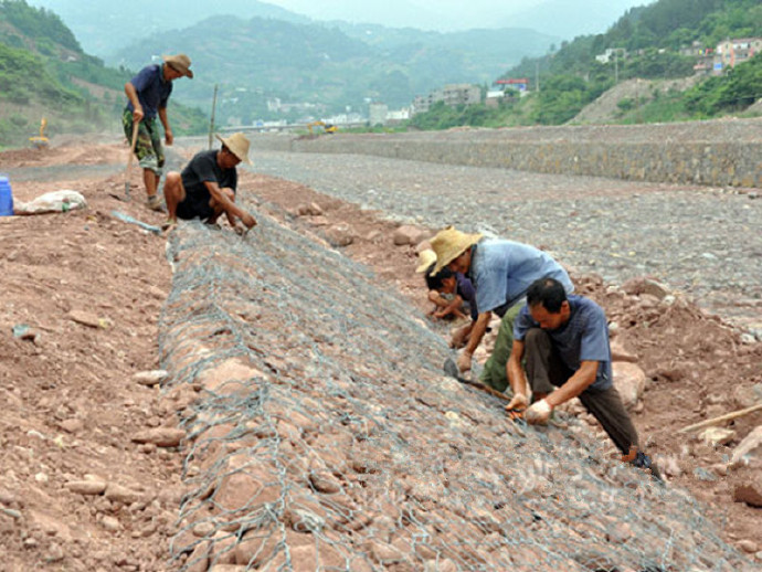 雷諾護(hù)墊是指由機(jī)編雙絞合六邊形金屬網(wǎng)面構(gòu)成的厚度遠(yuǎn)小于長度和寬度的墊形工程構(gòu)件,其中裝入塊石等填充料后連接成一體,成為主要用于水利堤防、岸坡、海曼等的防 沖刷結(jié)構(gòu),具有柔性、對地基適應(yīng)性的優(yōu)點。