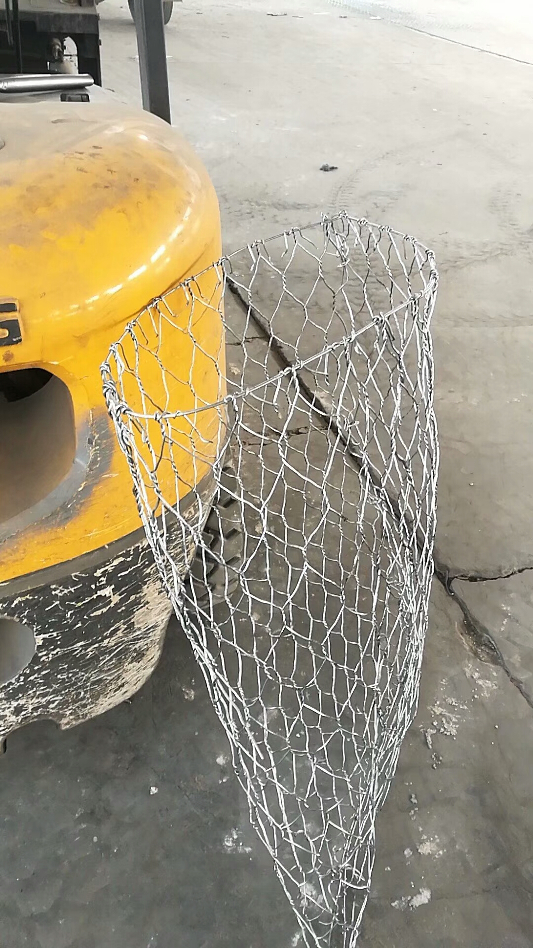 1組裝:將石籠網(wǎng)兜置于平實(shí)的地面展開,壓平多余的折痕,沿一側(cè)面螺旋旋轉(zhuǎn)成圓柱體,并用綁絲扎緊兩端。