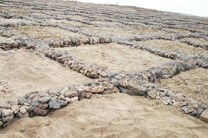 雷諾護(hù)墊作為整體性和柔軟性良好的結(jié)構(gòu),較好的適應(yīng)了基床土壤的局部沉降,并且通過內(nèi)部的小變形可釋放結(jié)構(gòu)內(nèi)的集中應(yīng)力,不會產(chǎn)生結(jié)構(gòu)性損傷。避免采用剛性砌體結(jié)構(gòu)可能產(chǎn)生的不均勻沉降開裂、破壞點易迅速擴(kuò)散的問題