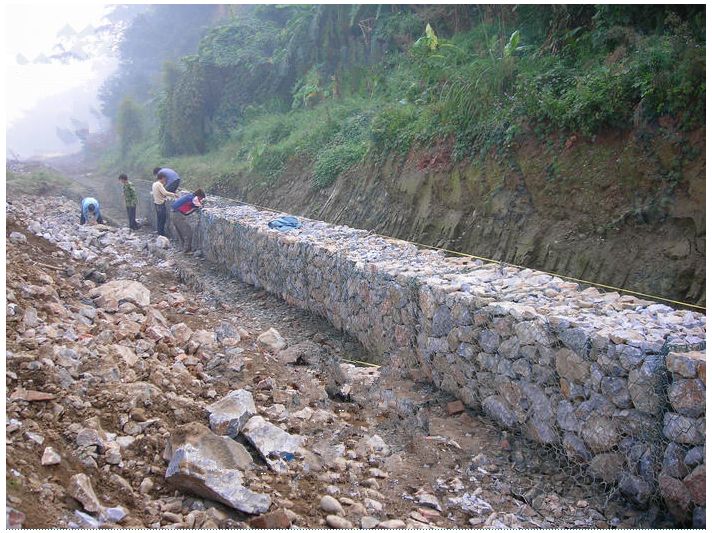 石籠網(wǎng)擋土墻,是石籠網(wǎng)籠子層疊堆砌的擋土建筑物。石籠網(wǎng)箱擋土墻的構(gòu)件是在網(wǎng)箱內(nèi)部填充大小比例相當(dāng)?shù)氖瘔K,這樣就有一定的孔隙率,由于石塊之間的間隙,可以排出砌體后面的土壤和護(hù)坡下面土層的水,這樣就降低了水位,減少墻體后和坡下的地表水壓力,水及時(shí)排出降低了擋土墻被破壞的幾率,這樣擋土墻的壽命會(huì)大大的延長(zhǎng)。同時(shí)墻體網(wǎng)箱是鐵絲網(wǎng)制作的籠子,能夠有一定的變形,況且,石塊與石塊之間,也可以滑動(dòng),所以擋土墻的變形能力也能夠緩沖突發(fā)的外力。